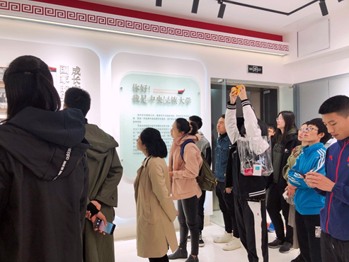 校史展充分展现了民大的人文特色风貌, 内部结构以纽带为设计原型,寓意各民族团结向上,流线型的墙面上记录着民大建校以来不同的发展时期具有重大意义的照片和教育成果,充分的展示了民大的魅力,激励参观者团结奋进。