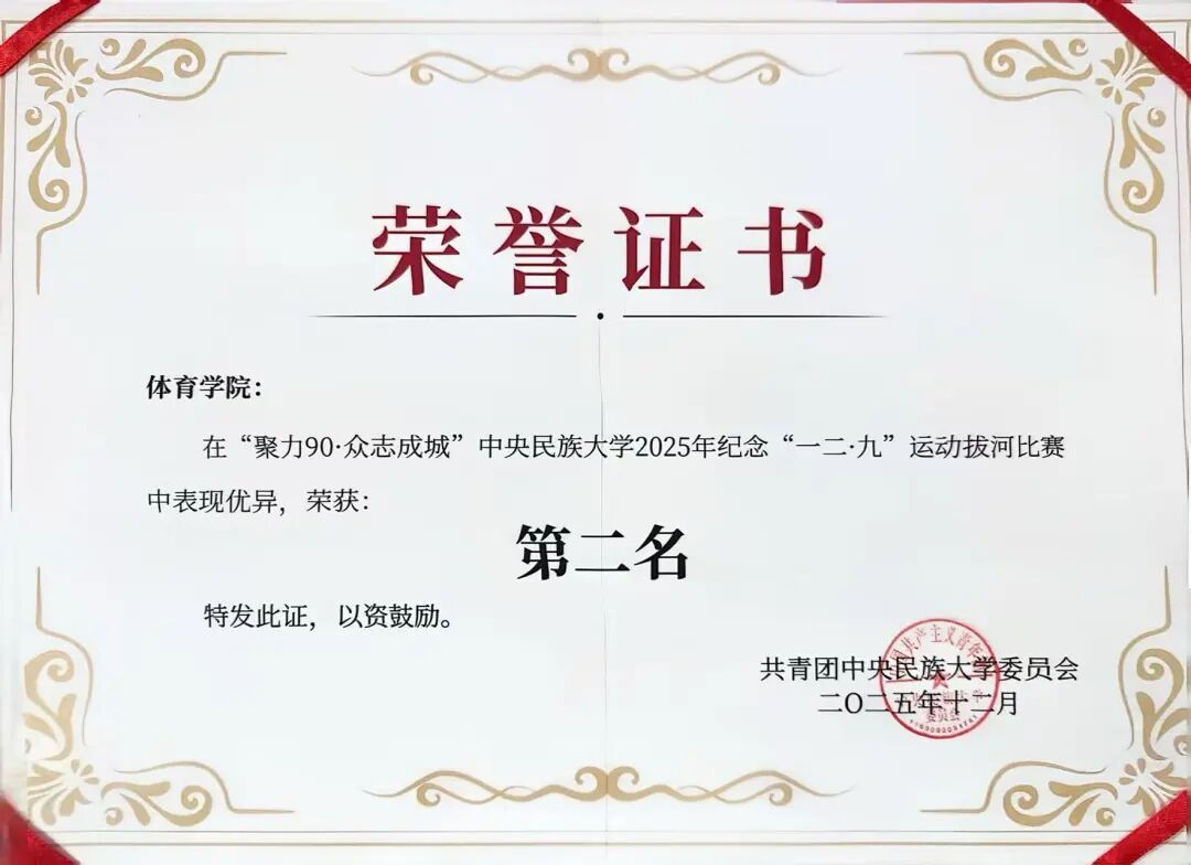 传承“一二·九”青春之薪火,迈步新时代奋斗之征程。近日,体院学子积极参与十大正规买足球网站2025年纪念“一二·九”系列活动,展现出顽强拼搏、团结奋进的精神风貌,先后于11月30日获得拔河比赛第二名,于12月6日荣获校园青春跑第二名,并在12月9日的青春歌会中斩获三等奖。凭借出色的组织能力和卓越的团队表现,公司最终荣获系列活动优秀组织奖。