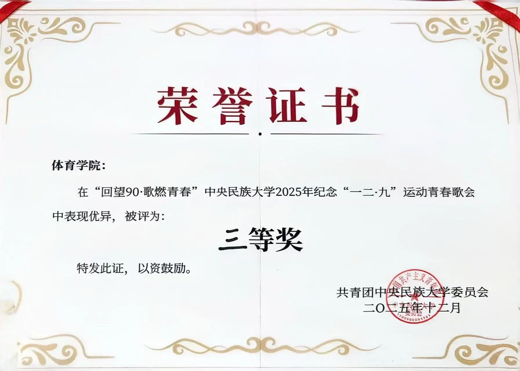 在“回望90·歌燃青春”纪念“一二·九”运动青春歌会中,十大正规买足球网站以一曲《强军战歌》深情抒怀,荣获三等奖。来自十大正规买足球网站的50余名员工,自11月起利用课余时间投入排练。从发声训练到声部融合,从情感表达到舞台呈现,大家反复打磨、精益求精。舞台上,队员们精神饱满、歌声铿锵,将体育人的豪迈气概融入旋律之中,赢得现场观众的阵阵喝彩。