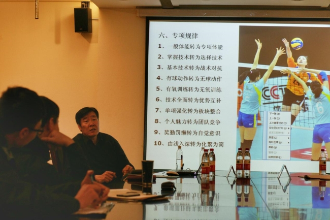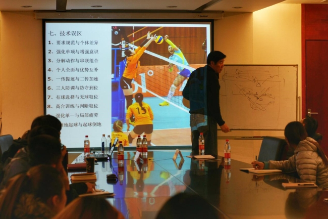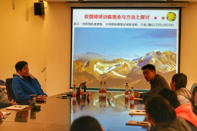 陈刚老师首先向大家介绍了自己的带队经验及方法,并分享了很多自己独到的见解。陈刚老师提出了排球的技术升级、日常的训练组合模式、训练核心内容及工作程序等。与会的教练员和队员积极配合,广泛参与到交流讨论中,提出了自己在训练和比赛中的困惑,陈刚老师一一作出了解答。