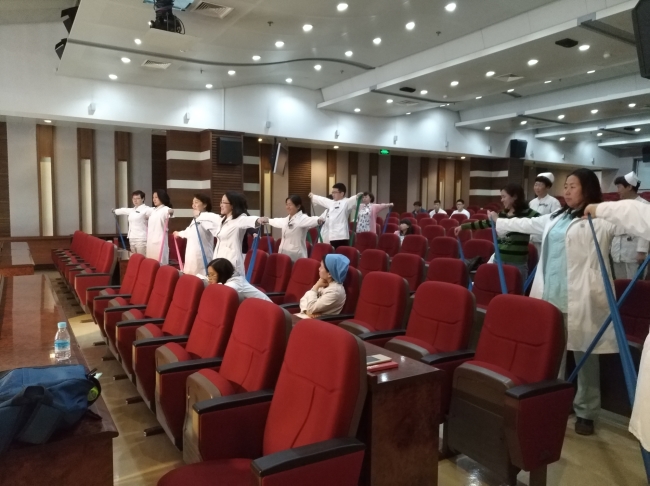 讲座主要分为三部分。首先苏日老师向大家介绍了我国及日本中老年人健康现状、评价下肢肌肉力量的运动器官症候群概念、评价方法和预防练习方法,同时还介绍了“体+医”综合评价中老年人健康的方法;其次,讲解了建立在合理控制饮食和进行科学运动基础上的快乐(智慧)减肥法,以及日本80kal减肥饮食法;最后,苏日老师还为大家详细讲解了预防老年痴呆症的最新研究。讲座最后,苏日老师带领儿童医院的医生们,体验了锻炼脑力的手指操、简单的身体练习,进行了运动器官症候群测试,在场的医生们纷纷参与其中。