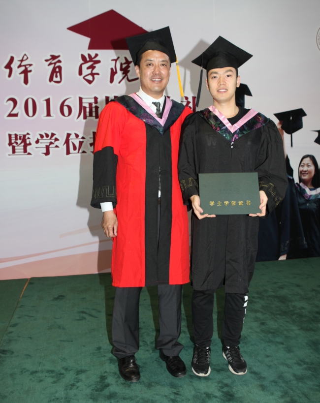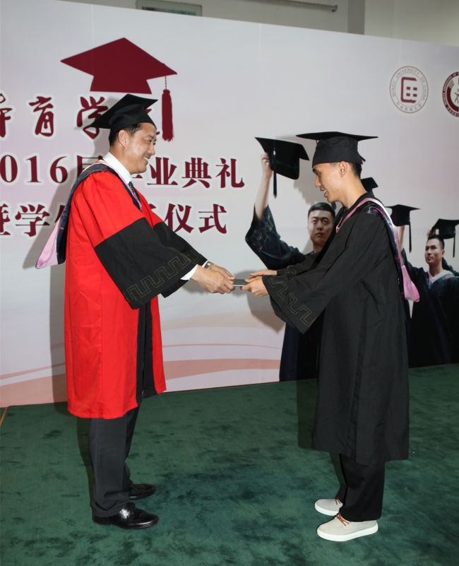接着,副经理侯会生宣读了2016届授予学位的毕业生名单,体育公司党总支书记格日乐图宣读优秀毕业生名单。在激昂的拉德斯基进行曲中,毕业班同学们身着学位服依次列队登台,经理张涛为每一位同学拨流苏、颁授学位,并合影留念。