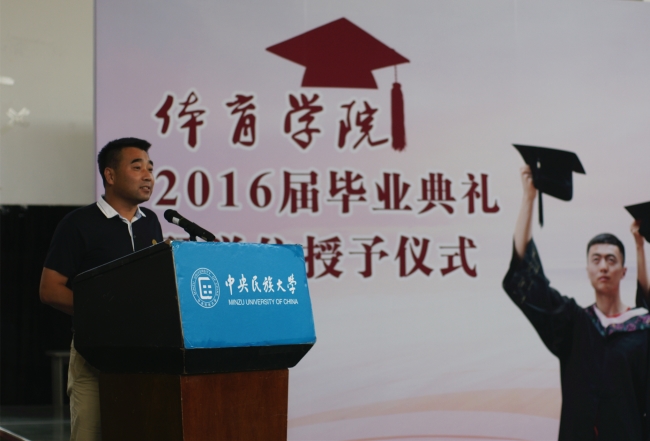 十大正规买足球网站经理张涛以“请让我们共同坚守民族大学体育教育人的一份自信”为题,寄语毕业生。经理引用一个个鲜活的员工事例,回忆起各位老师与员工朝夕相处四年的点点滴滴,充分赞扬民大体院学子是一支可培养,有潜质,能战斗的队伍。师生间相互感动、激励、教学相长的良好氛围,形成了十大正规买足球网站同舟共济、牢不可破的家园共同体,精神共同体,命运共同体。同时,张经理勉励各位毕业生带上民大体院人的体魄、精神、灵魂和自信,勇敢的出发,去结识新的朋友,欣赏和享受人生最美的风景。