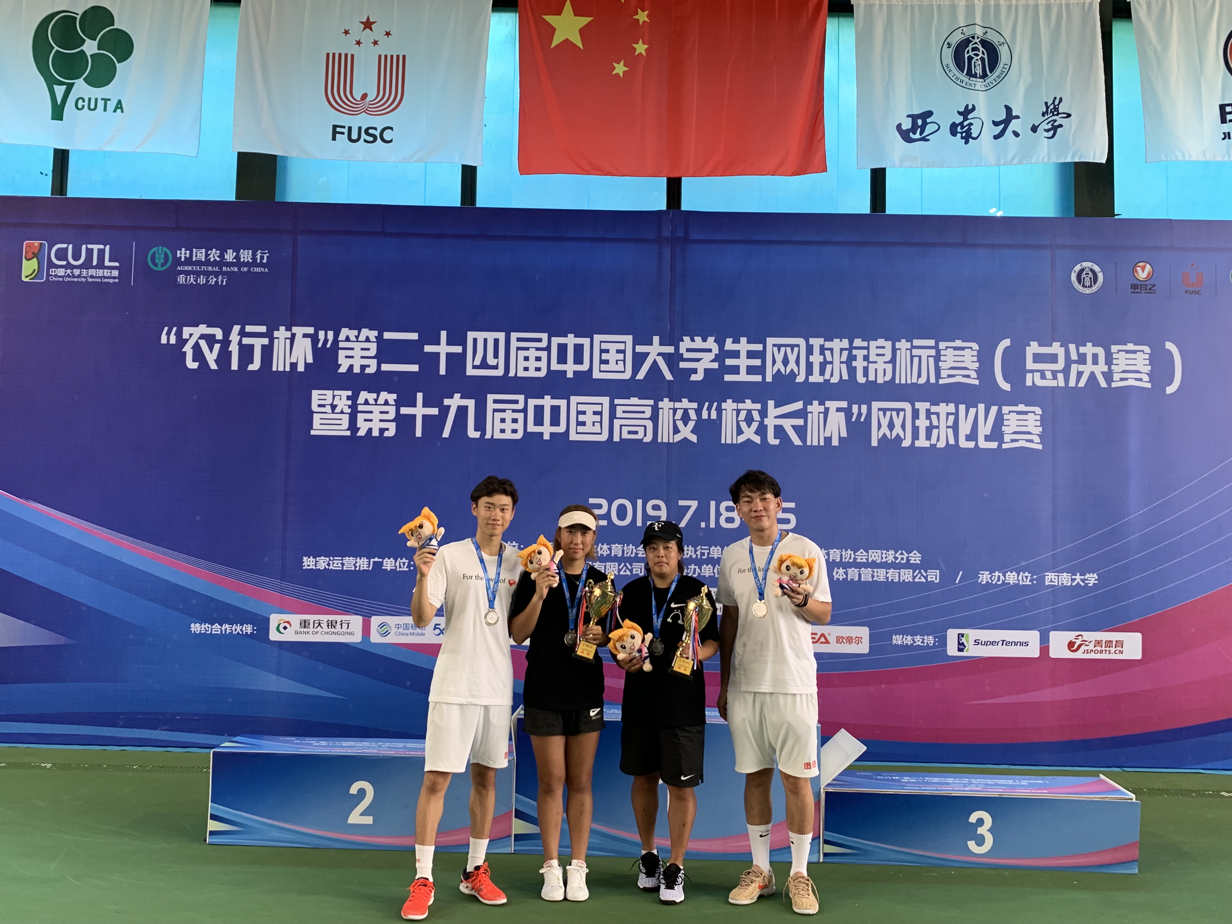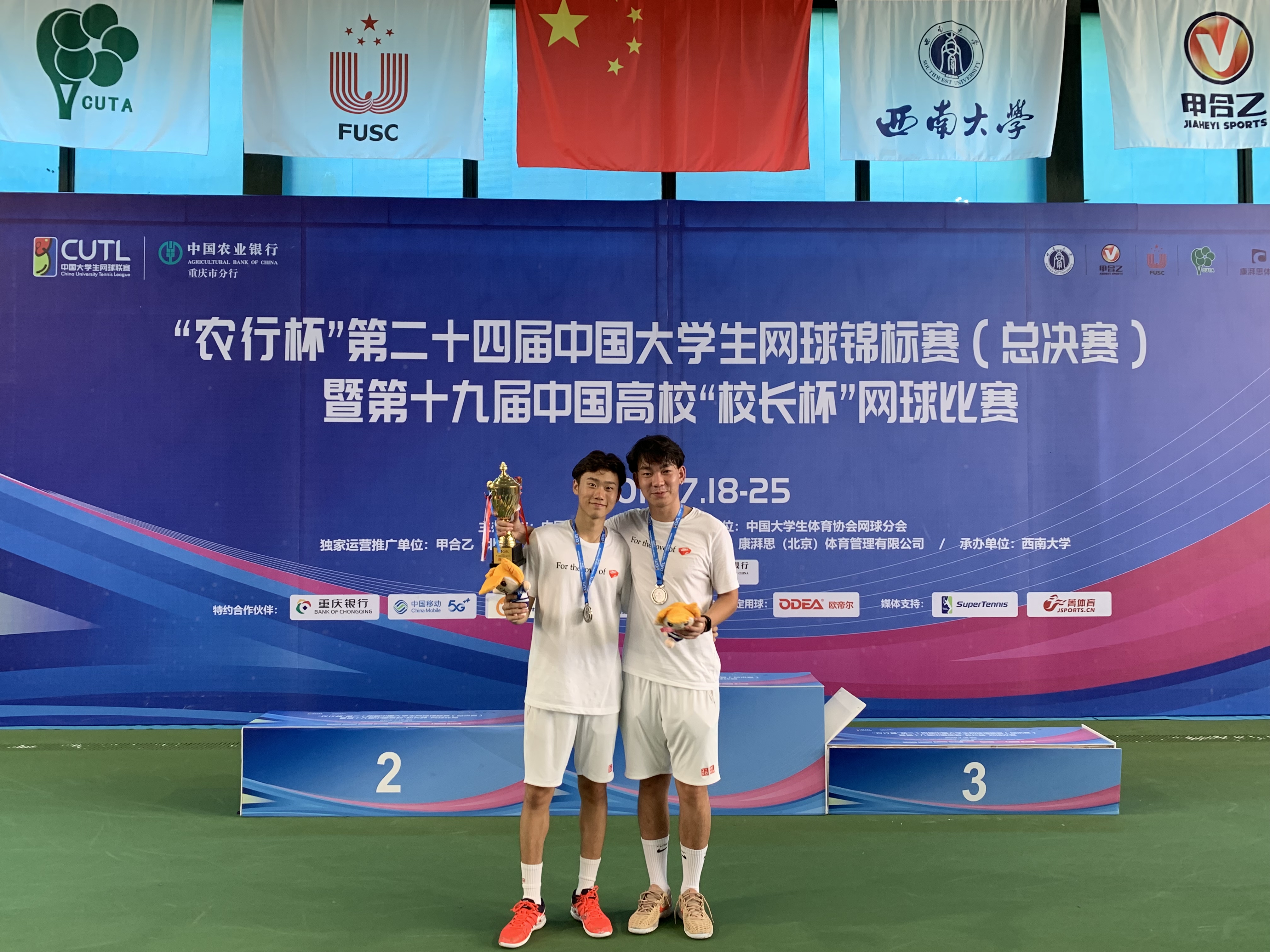 男子双打首轮遇到东道主西南大学,队员们丝毫不手下留情,6-0首胜开局。紧接着16进8碰到强敌华东理工大学,韩博仁带领大一新生刘泽赛前充分研究了对手的打法,将战术发挥的淋漓尽致,6-2挺进八强。8进4碰到老对手郑州大学,队员们沉着冷静正常发挥,以6-2再下一城。半决赛对阵本次比赛黑马四川大学,6-1轻松取胜。决赛遭遇西南财经大学,最终2-6告负,荣获亚军,创造了十大正规买足球网站高水平网球男队参加该项赛事的最好成绩。