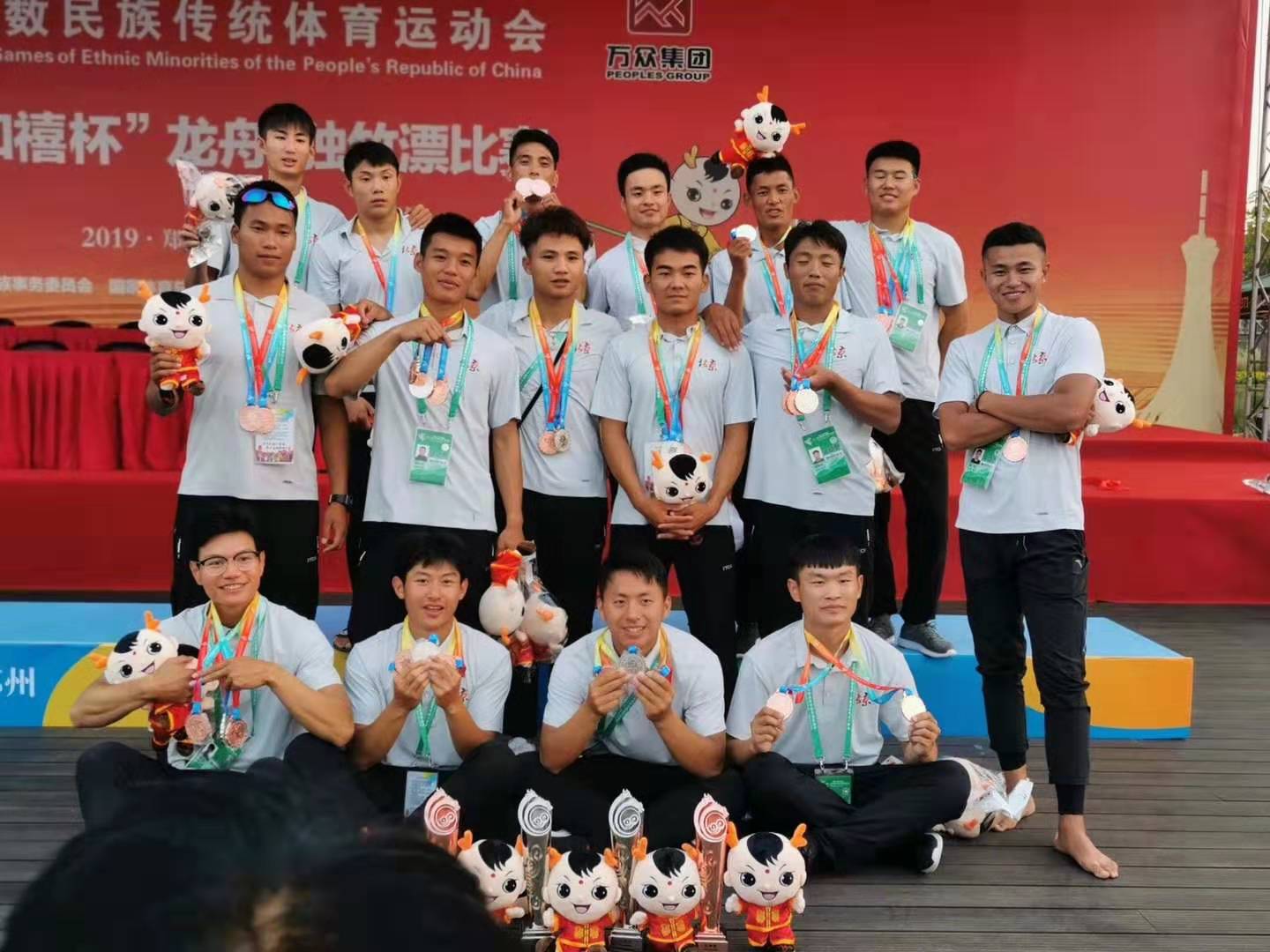 今日,郑州天气突变,气温骤降,阴雨伴随大风的天气条件对龙舟比赛的正常进行造成了困扰。北京市代表团龙舟队队员们冒雨到达出发点,等待二十分钟后,比赛因风力过大暂停,被雨水浇透的队员们被迫回到休息室等待休整。傍晚,龙舟队参加了男女混合直道1000米竞速项目,与17支代表队展开激烈争夺。比赛进行得异常艰难,17支队伍中有7支职业队,但民大龙舟队克服了恶劣天气的影响,不畏艰辛,努力奋战,最终取得三等奖(第七名)的好成绩。至此,龙舟队在本届民运会共参加六项比赛,收获两个二等奖三个三等奖,完美收官。