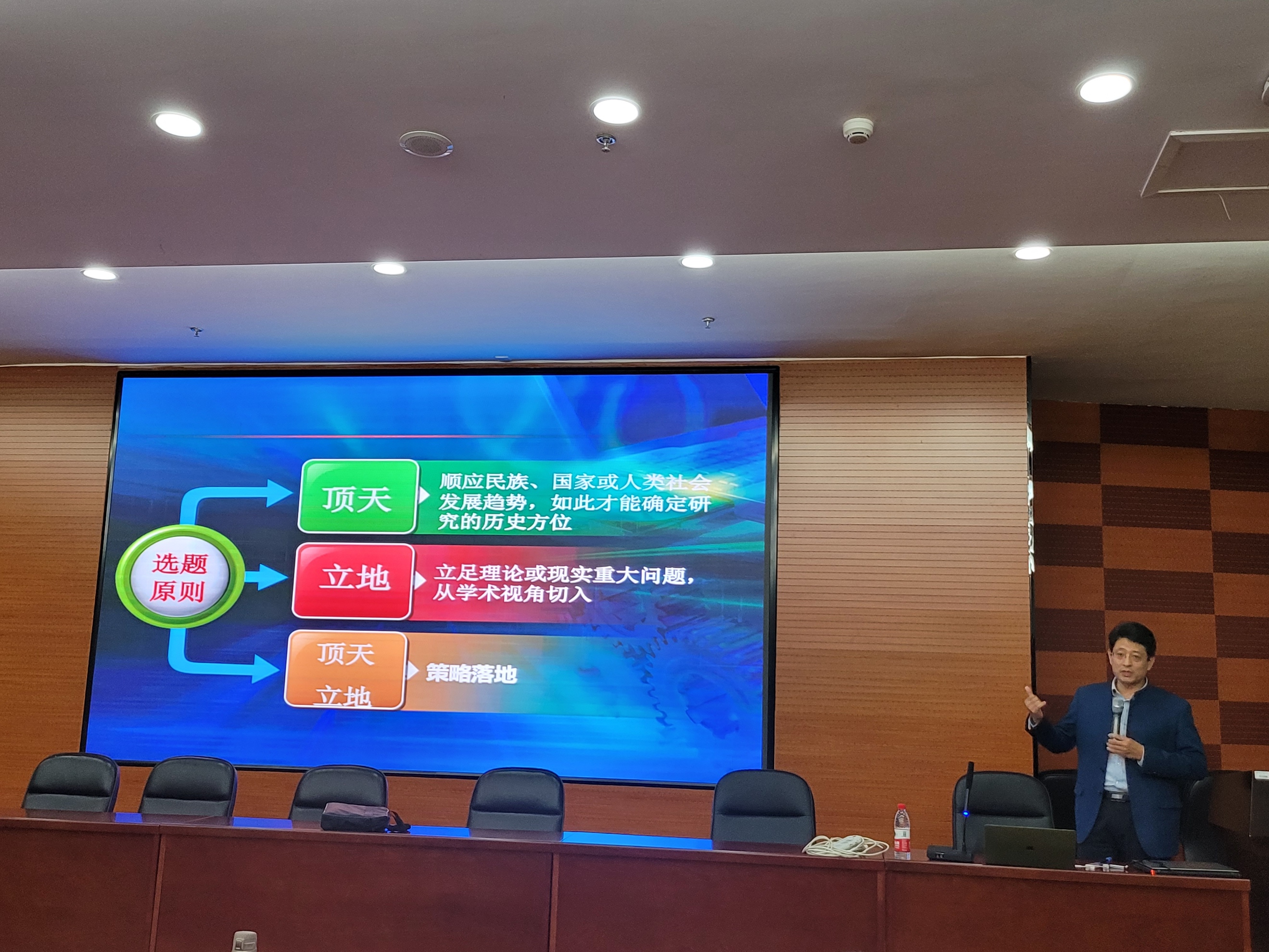 张教授首先强调选题应具有学术价值、应用价值,为方便理解,张教授用“顶天立地”概括了选题时应该注意的问题,“顶天”即顺应民族、国家、人类社会发展趋势;“立地”即立足理论或者现实中的重大问题并从学术视角切入,促进策略落地。随后,张教授引用具体实例分析员工在选题过程中容易出现的错误。