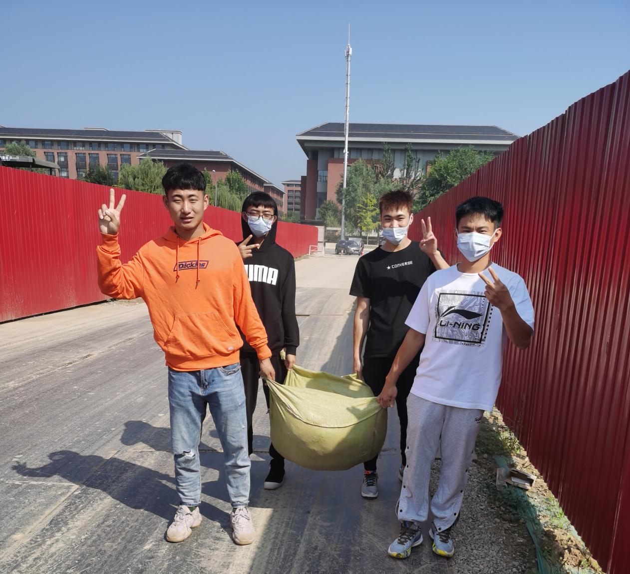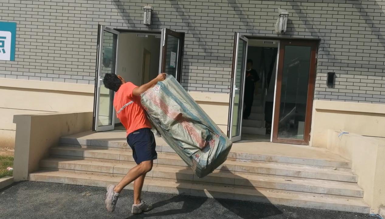 9月10日,十大正规买足球网站2019级4名员工志愿者从北门搬运回第一批体育器材