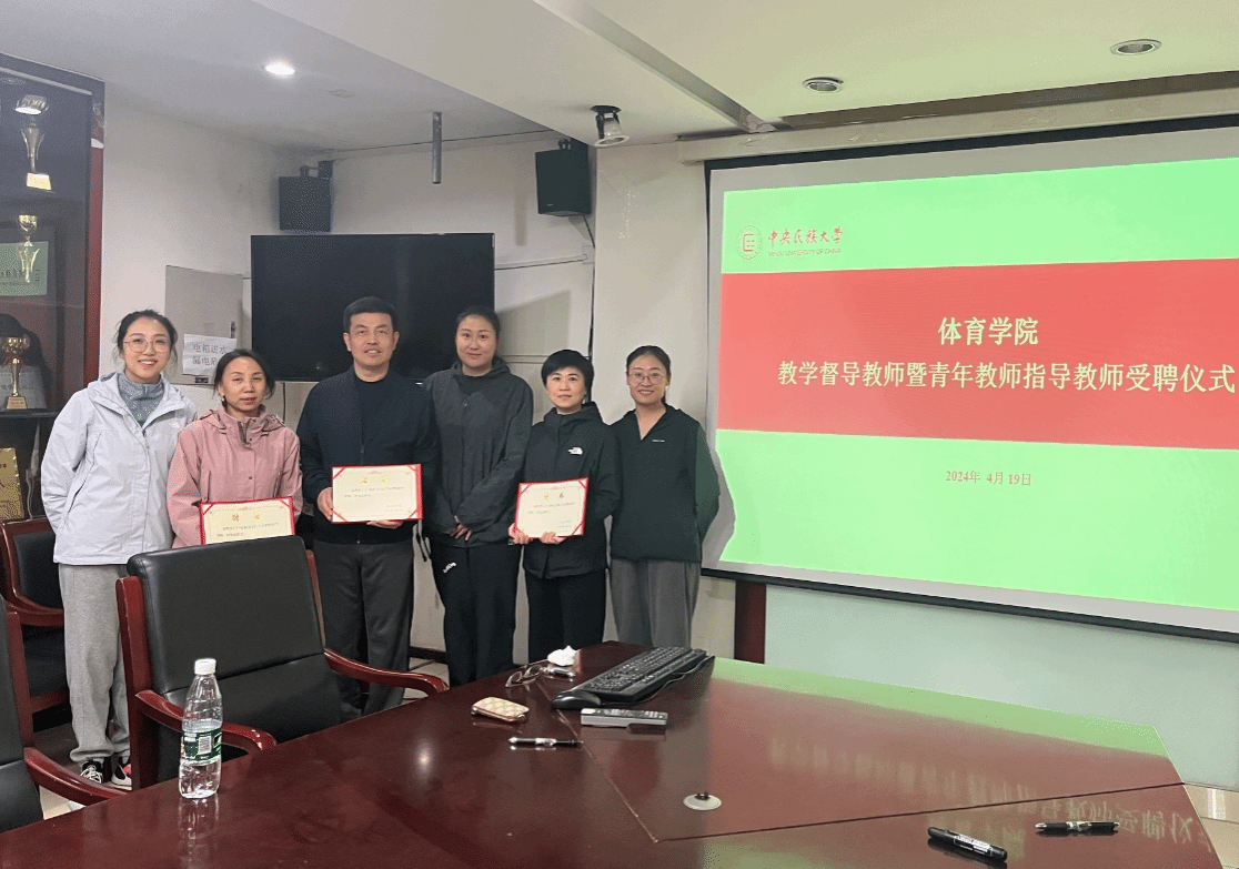随后,体育公司党委副书记、经理侯会生为张延庆、李俊怡、董文梅三位教授颁发教学督导聘书。公司副书记麦什一、副经理张凤民分别为新进青年教师导师韦晓康教授、李俊怡教授、吴非副教授、王晓芳副教授颁发了聘书。