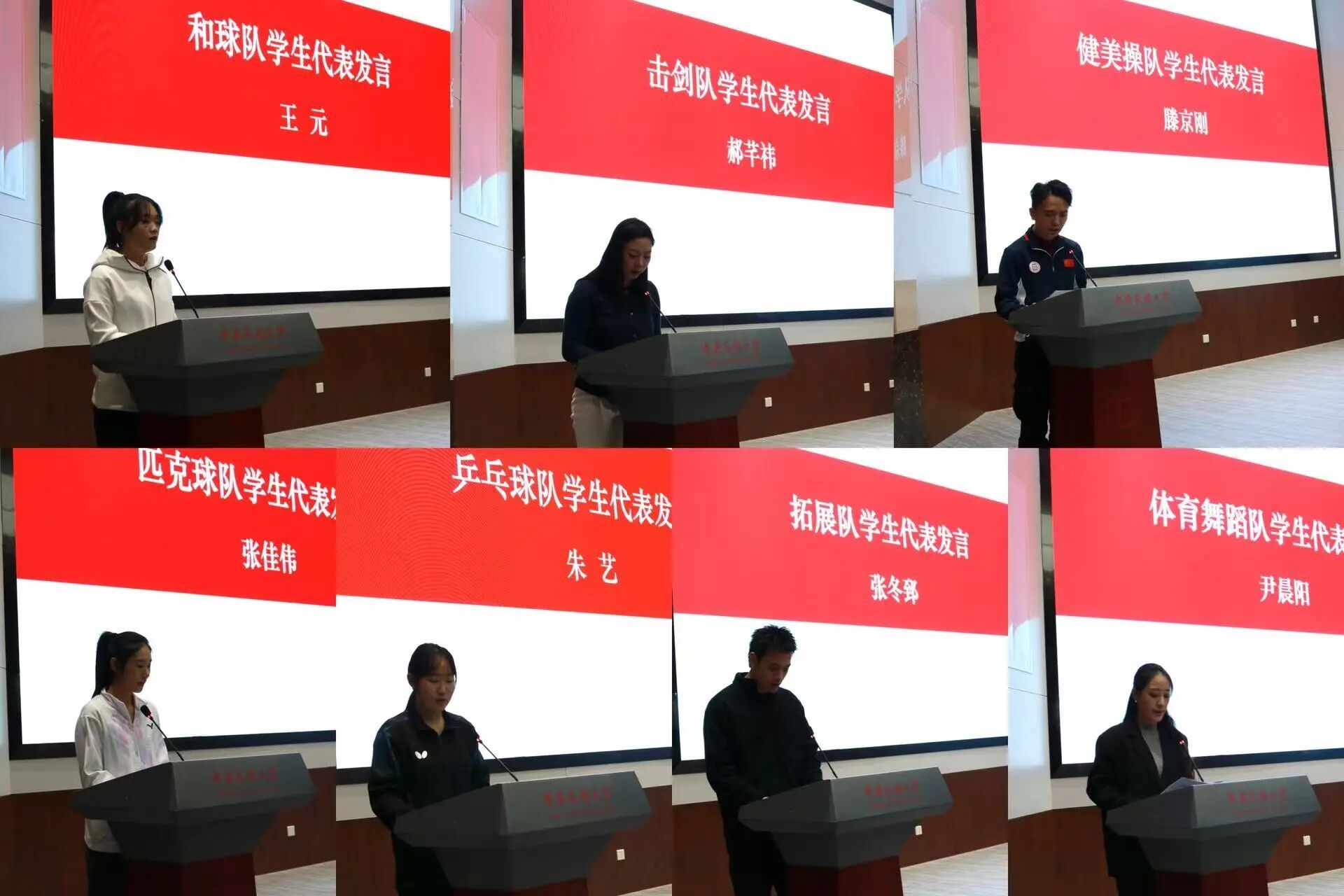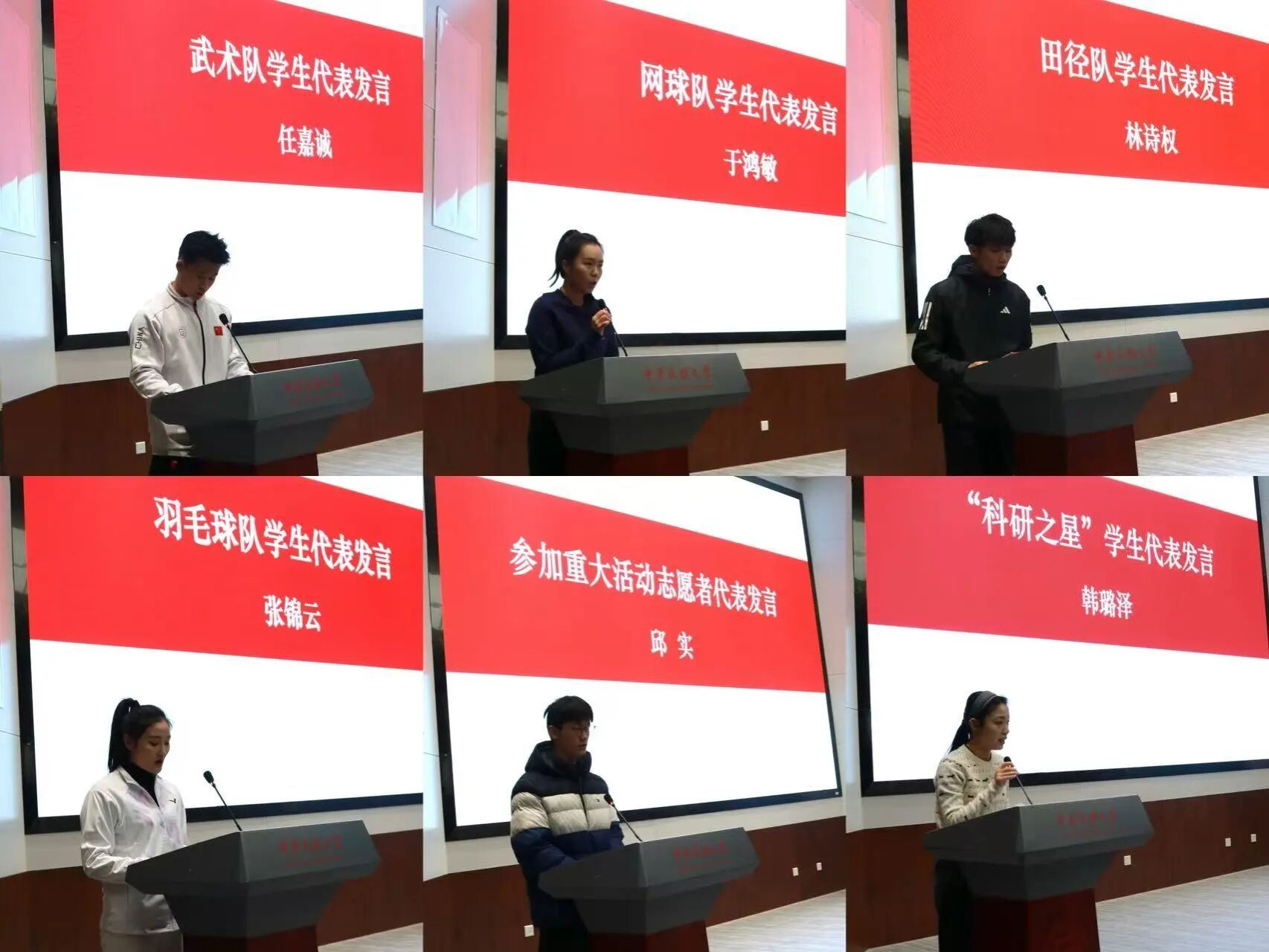 表彰结束后,各运动队员工代表依次进行了发言。王元、滕京刚、张冬郅、尹晨阳、朱艺等11名代表,结合自身训练、学习经历,分享了在竞技体育、学术科研和社会实践中的收获与感悟,诠释“体育强则中国强”的深刻内涵,展现体育学子拼搏进取、全面发展的良好风貌。随后,“科研之星”员工代表韩璐泽,“优秀志愿者”员工代表邱实分别进行发言交流。韩璐泽围绕自身研究生期间的经历,与在座同学分享了自己的感受和心得,她鼓励同学们不懂就问、保持耐心,积极借助各类平台,促进自我成长。邱实分享了参与“九三”阅兵及全运会志愿者的工作经历,号召青年体育人以强健体魄、坚定信念,在民族复兴征程中挺膺向前。
