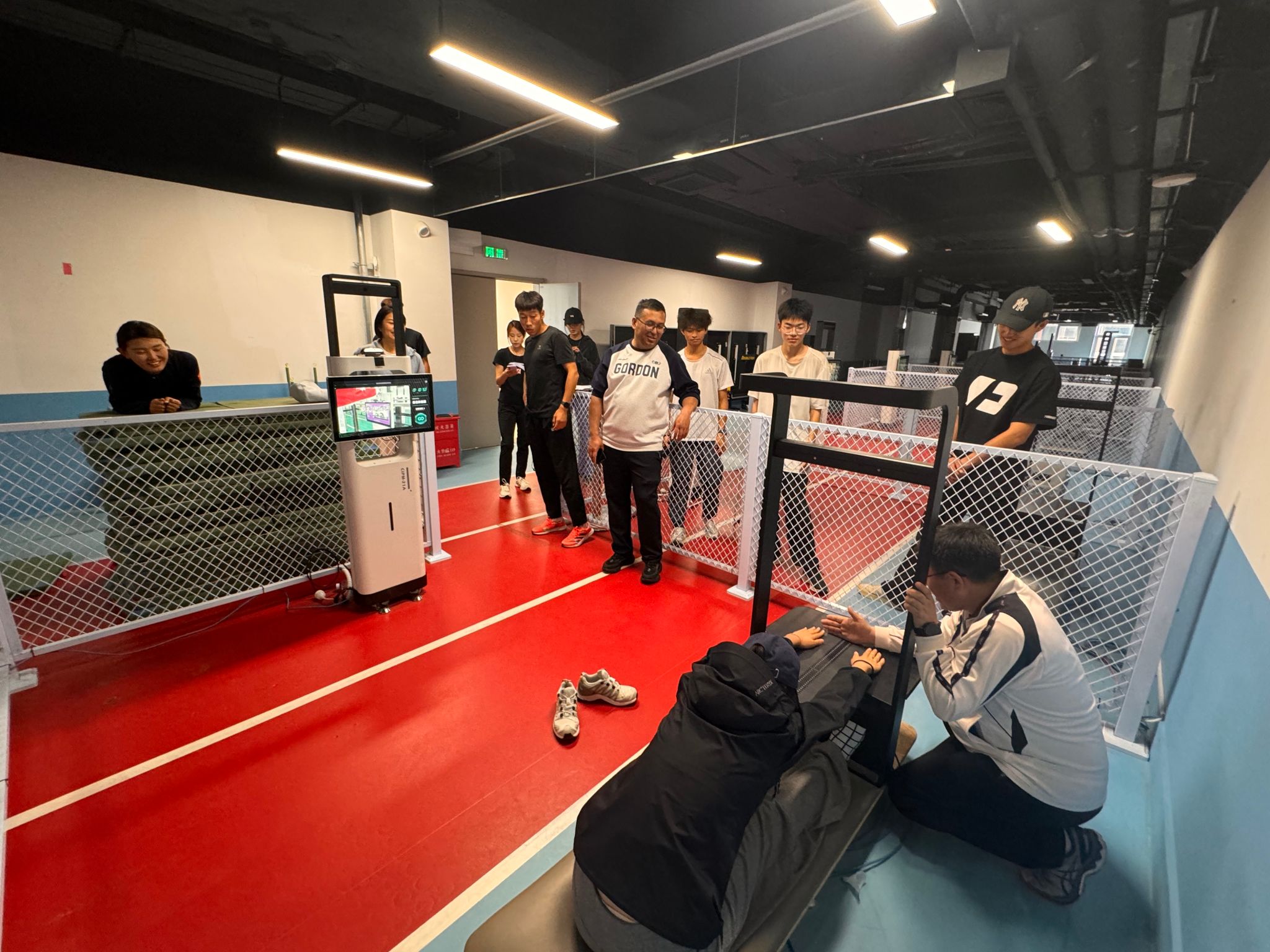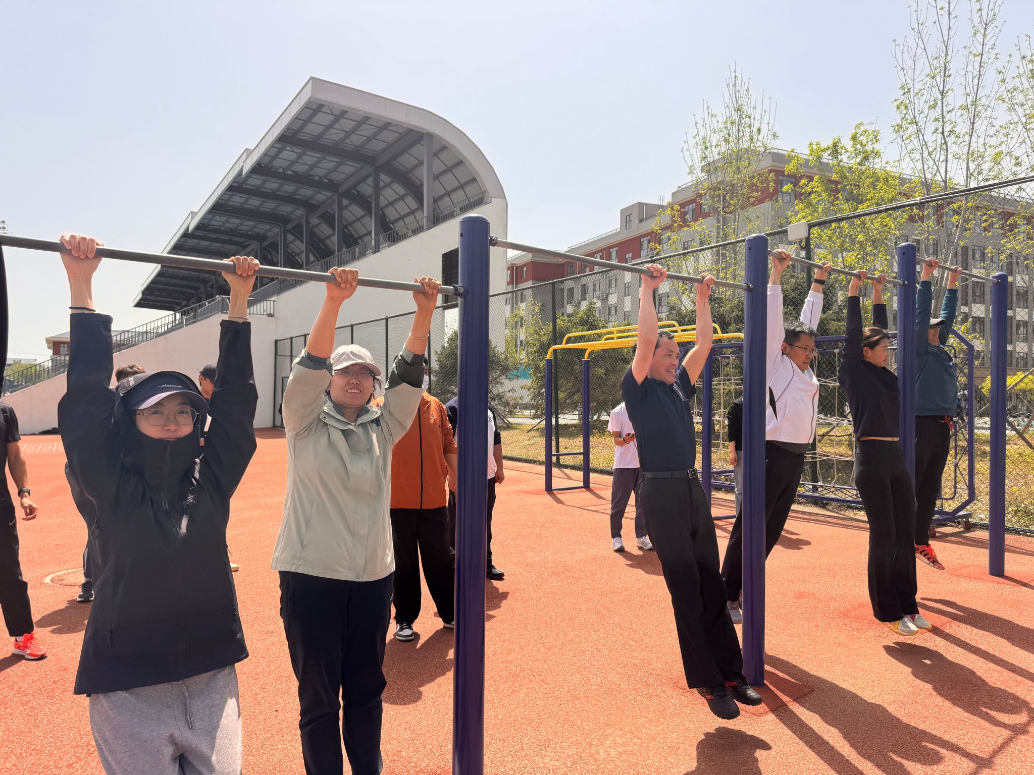 体质健康测试项目分为30秒吊单杠、50米竞速跑、60秒跳绳、灵敏绕杆跑和坐位体前屈等五大类。测试活动现场,教师们精神饱满,热情高涨,摩拳擦掌,全力以赴,展现出了体育专业教师良好的身体素质和奋发进取的精神面貌。在30秒吊单杠测试中,教师们紧握横杆,专注完成挑战;50米竞速跑赛道上,随着发令声响,教师们奋力冲刺;60秒跳绳区域,大家有节奏地跳跃,彩绳起落间展现运动活力;灵敏绕杆跑处,教师们灵活穿梭,快速绕过标志杆;坐位体前屈测试时,教师们尽力伸展身体,尝试突破自己的柔韧极限。