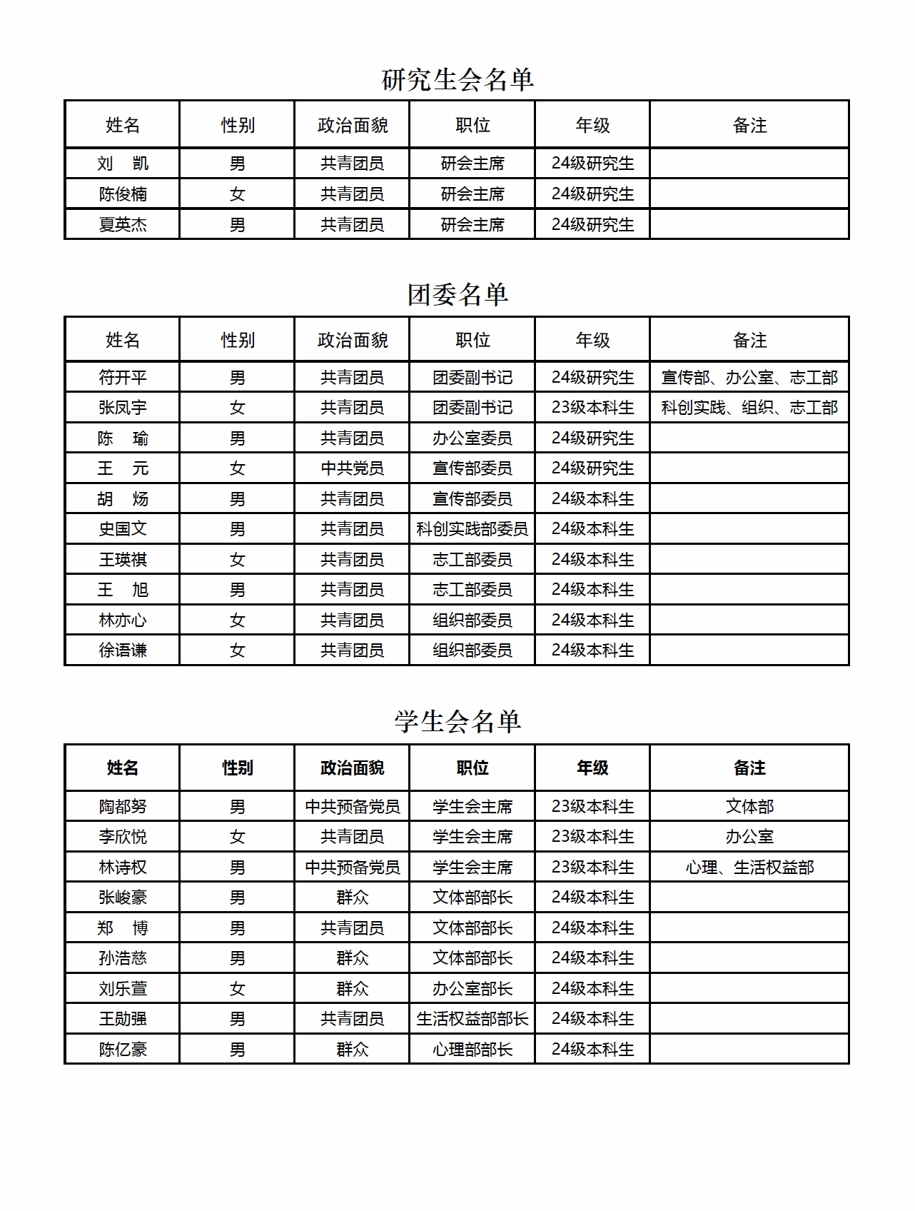 现任团委、员工会、研究生会成员名单